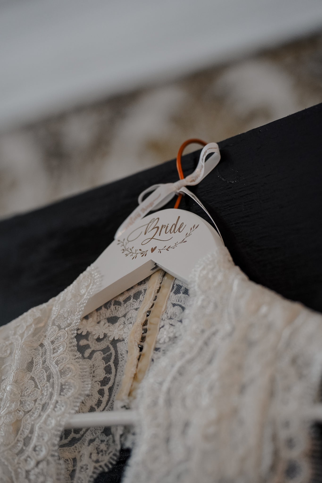 Die klare Form des Holzkleiderbügels sorgt dafür, dass das Brautkleid perfekt hängt und auf Fotos besonders schön zur Geltung kommt. Ob beim Getting Ready, für Detailaufnahmen oder als dekoratives Andenken – dieser Bügel bringt das Kleid und den Moment zusammen.