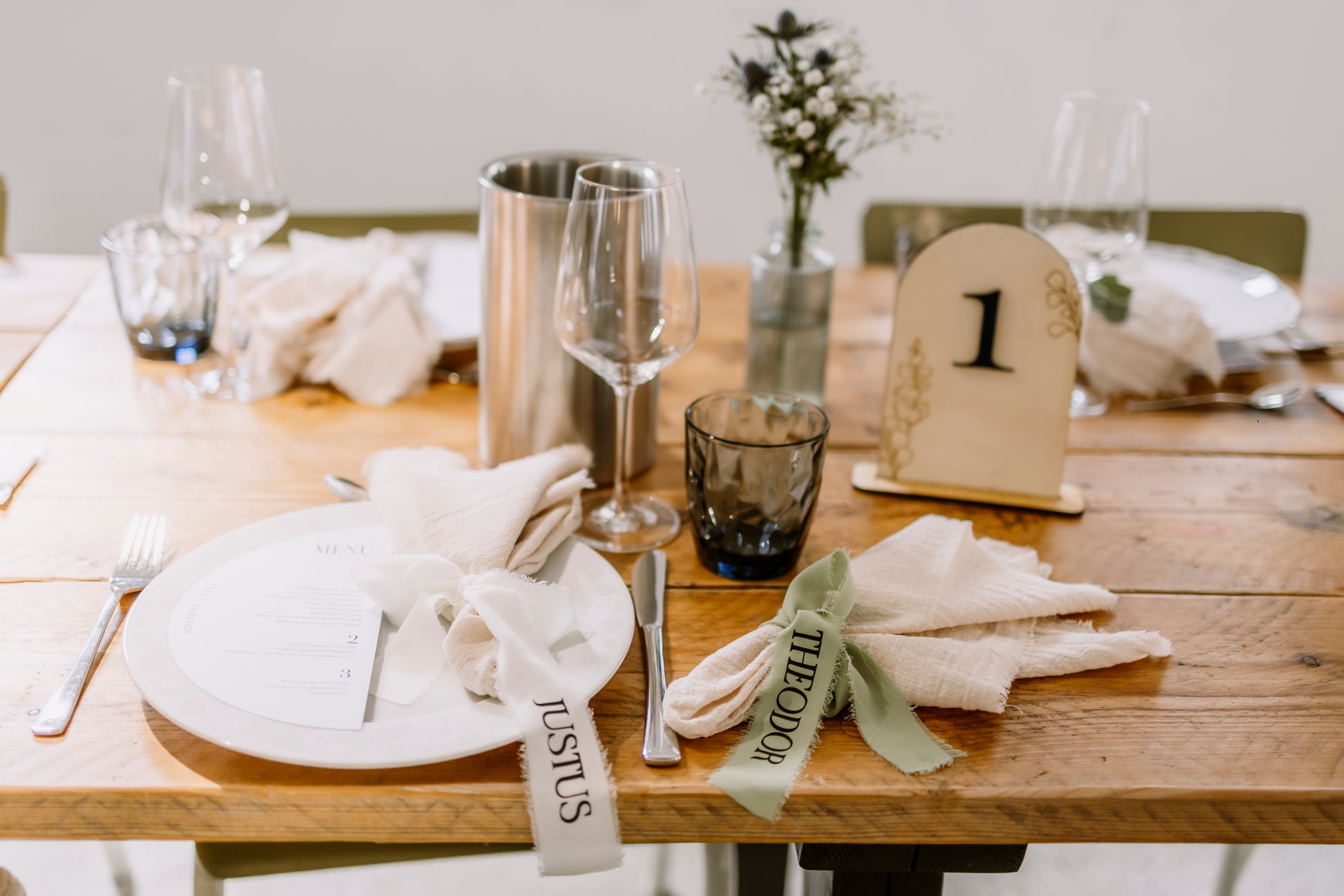 Diese zarten Chiffon-Gläserbänder verleihen jeder Hochzeit, jedem Sektempfang und jeder Festtafel eine elegante, moderne Note. Jede Schleife wird sorgfältig von Hand gebunden und mit einer hochwertigen Vinyl-Beschriftung versehen – ideal für Bride, Groom, Namen, Initialen oder kurze Worte.