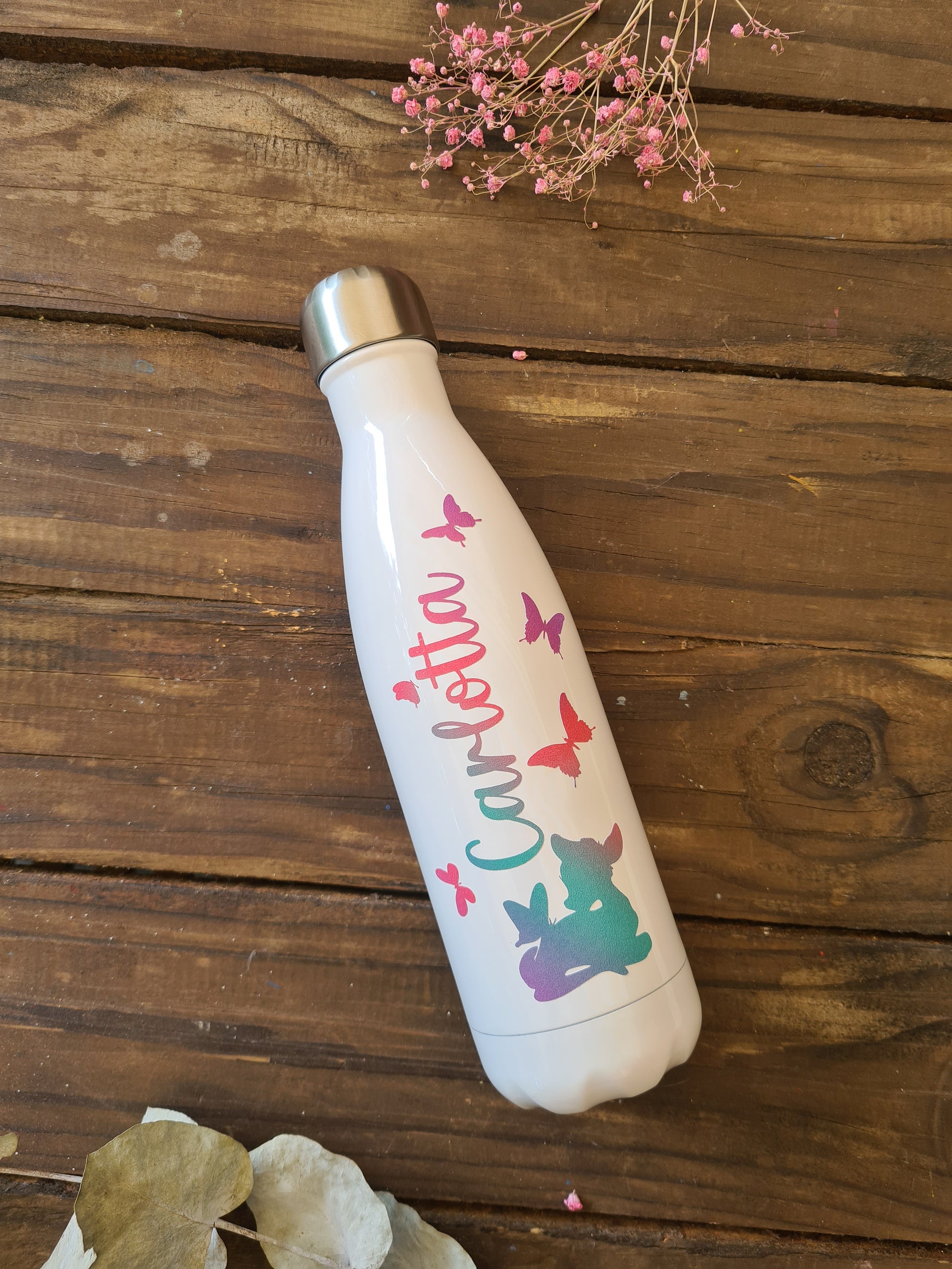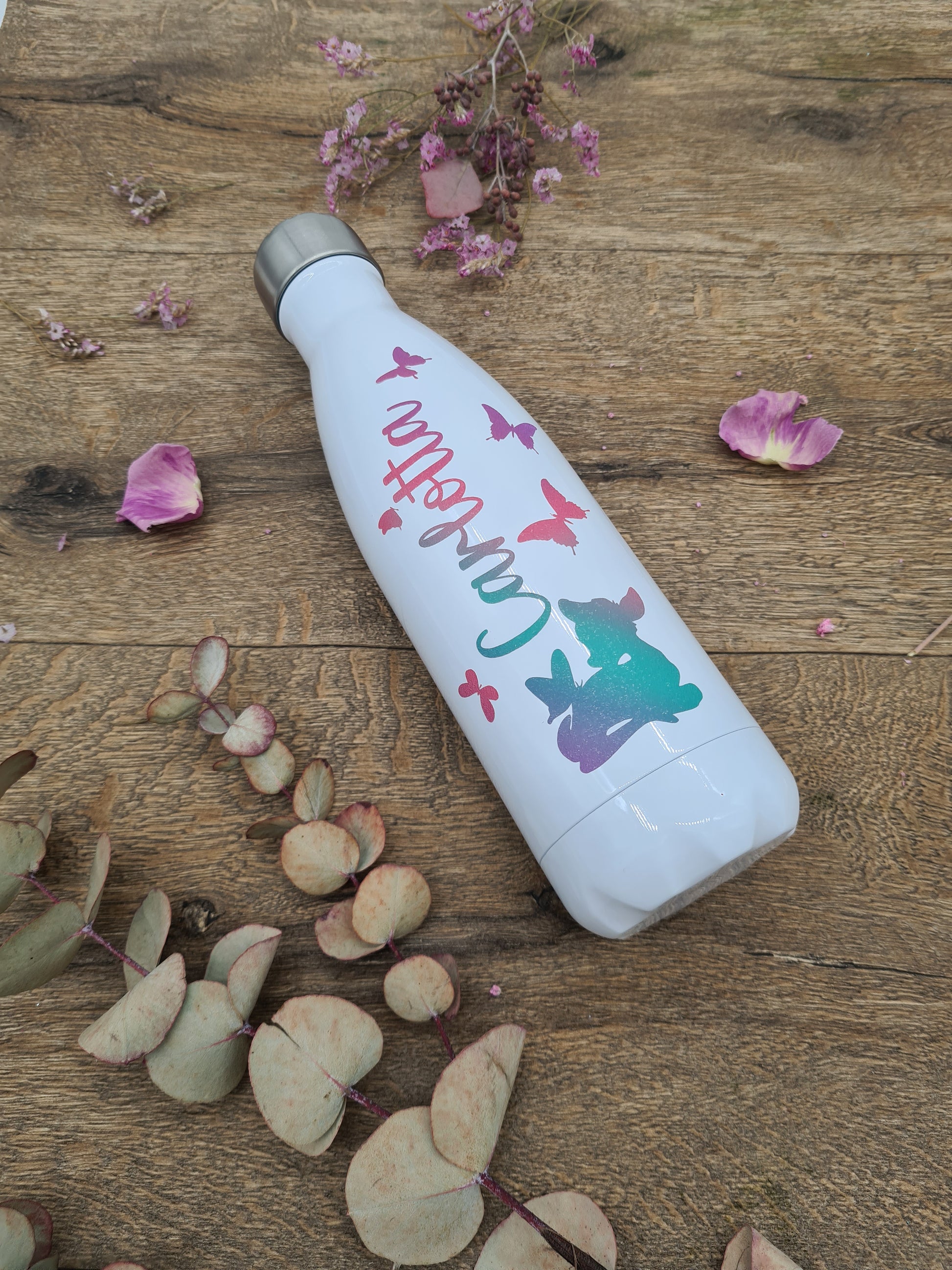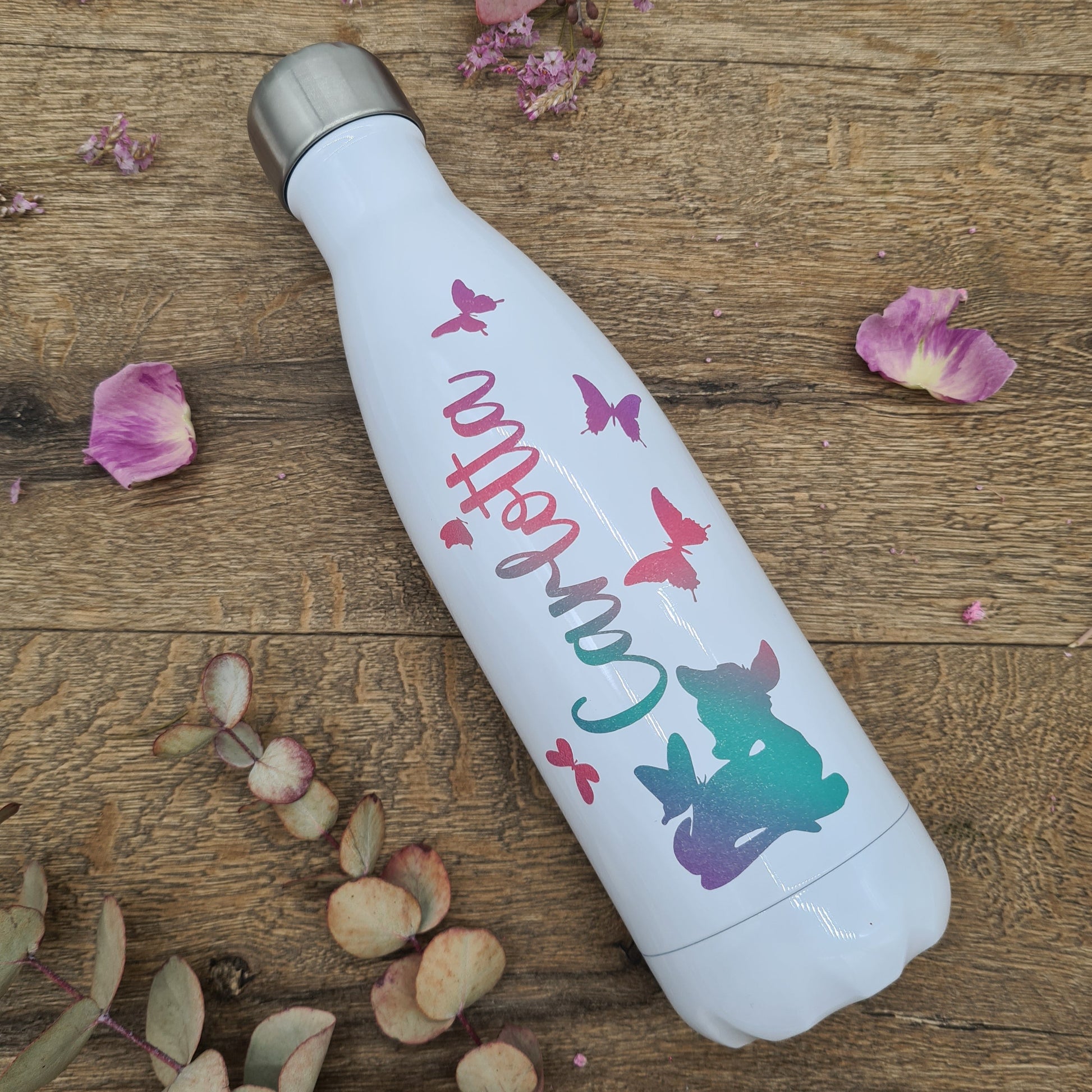 Personalisierte Schmetterlings- und Hirsch-Vakuumflaschen in Weiß mit pastellfarbenen Regenbogenfarben, Kinder, 500ml, heiß und kalt