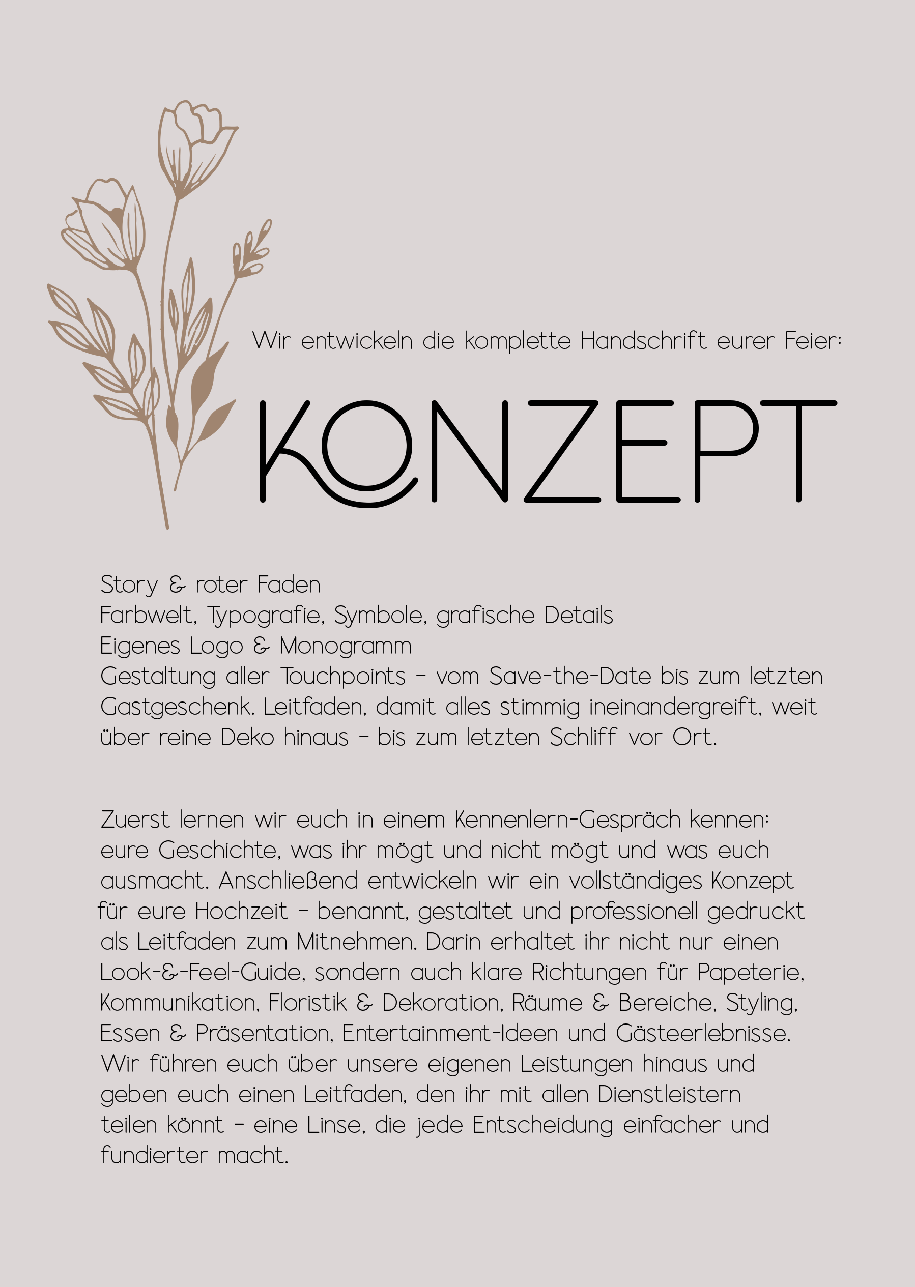 Nach einem kostenlosen Beratungsgespräch entsteht euer persönliches Konzeptbuch – das Fundament eurer gesamten Hochzeitsplanung. Es erzählt eure Geschichte, schneidet durch das Planungschaos und verbindet alle Elemente eurer Feier zu einem stimmigen Ganzen.