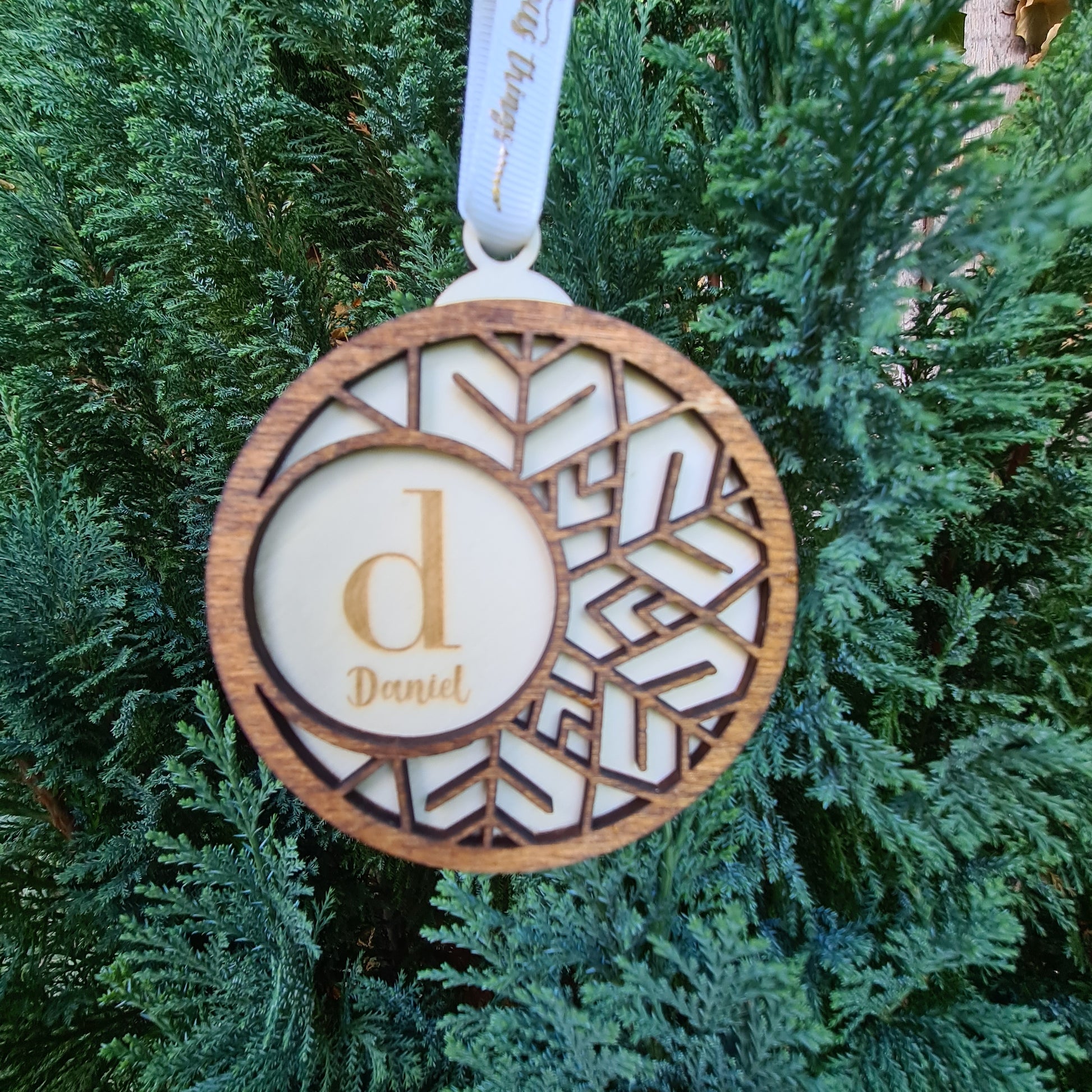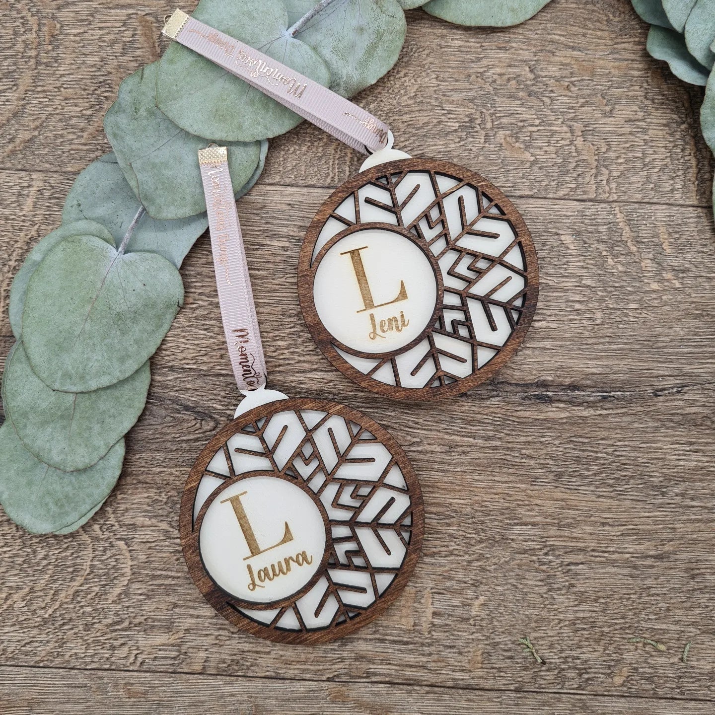 Doppelter Holzanhänger für Weihnachten, mit Schneeflocken-Design, personalisiert mit Wunschtext im minimalistischen nordischen Stil mit Buchstaben und Namen (Nordische Schneeflocke)