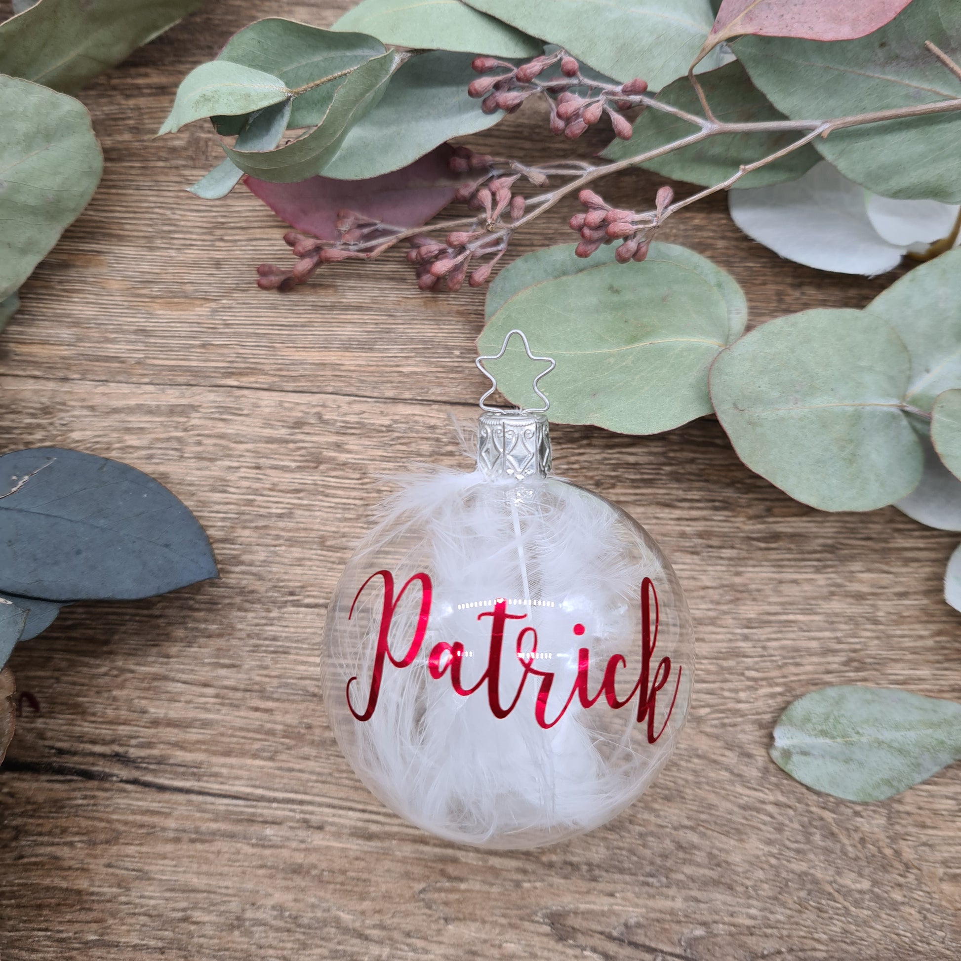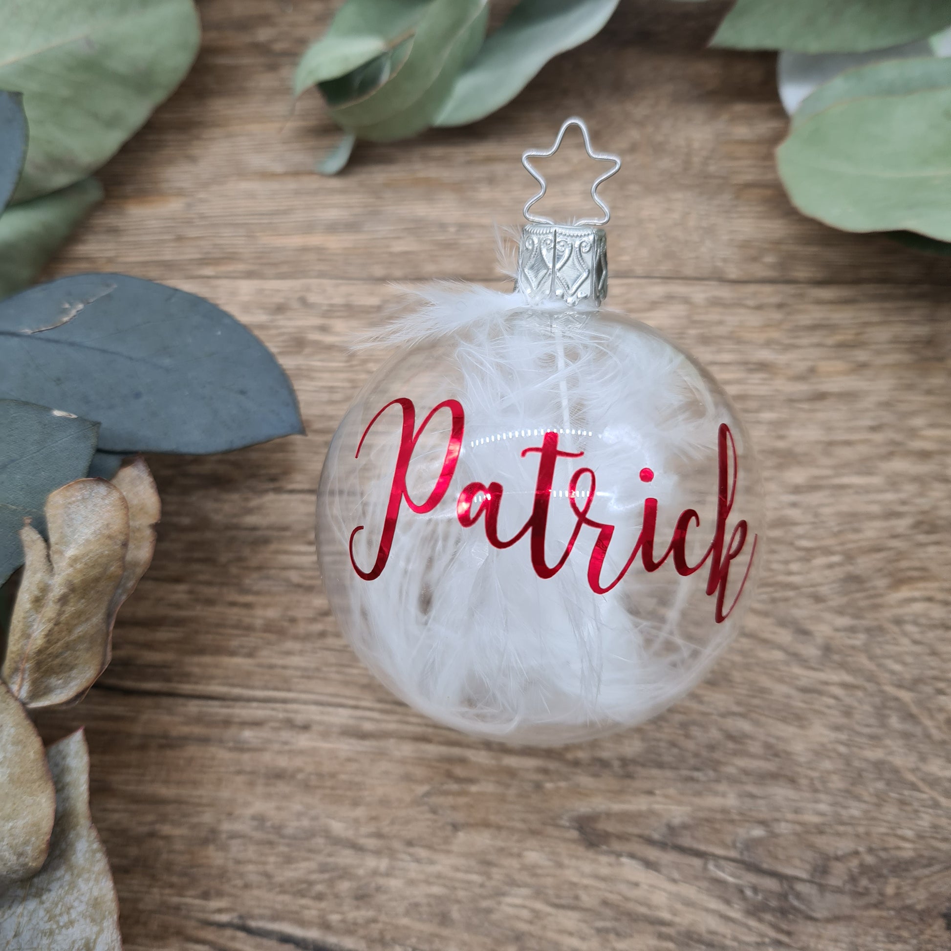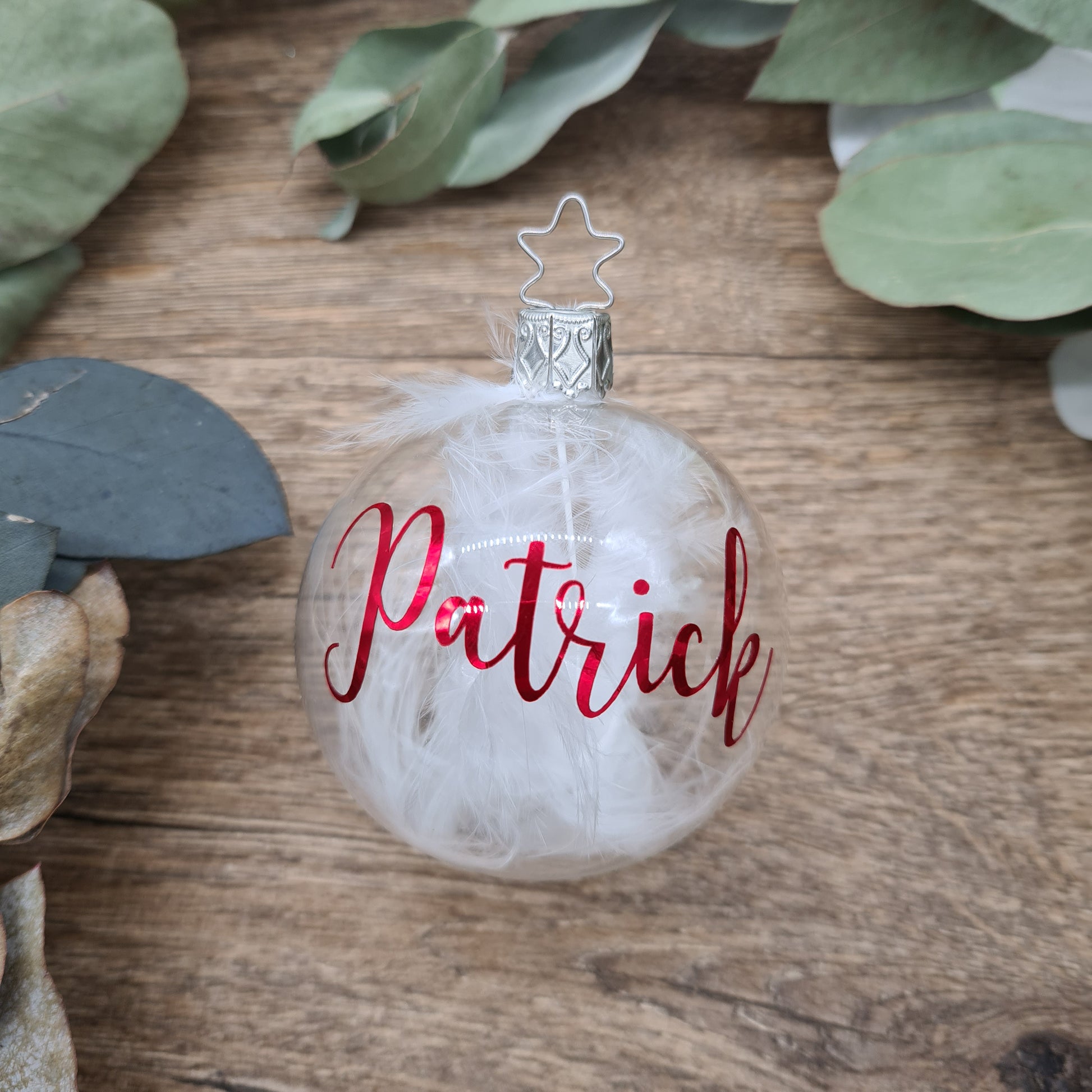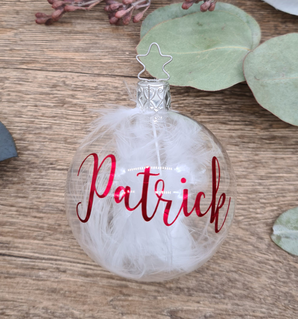 The Christmas Ornament is filled with white feathers and personalised with metallic red.