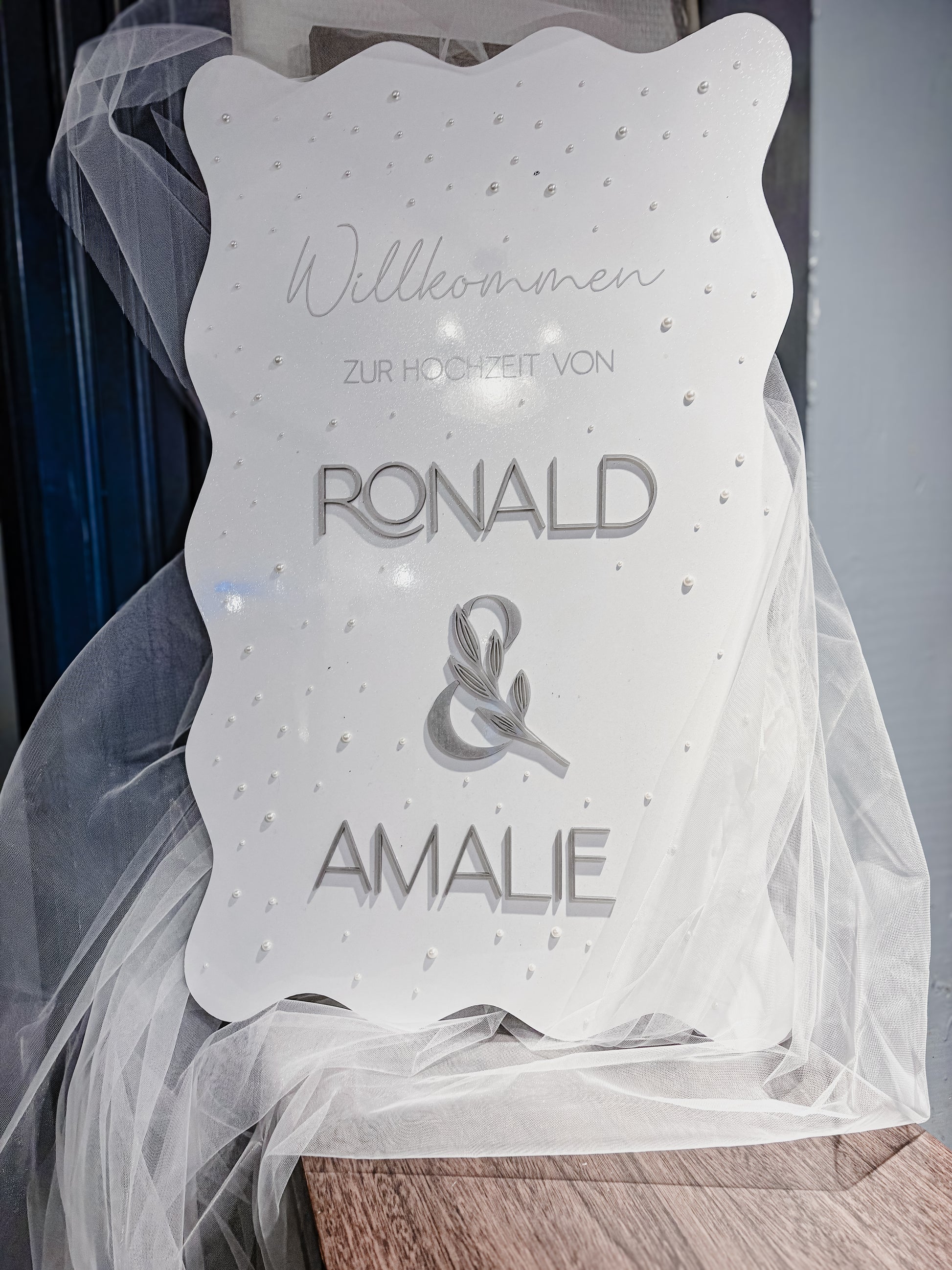 Dieses exklusive Willkommensschild zur Hochzeit beeindruckt durch ein modernes, weiches Wellen-Design, das sofort ins Auge fällt. Die hochwertigen 3D-Acrylbuchstaben verleihen den Namen des Brautpaares Tiefe und Eleganz, während feine Perlen- bzw. Tropfendetails eine edle Struktur über die Oberfläche streuen.