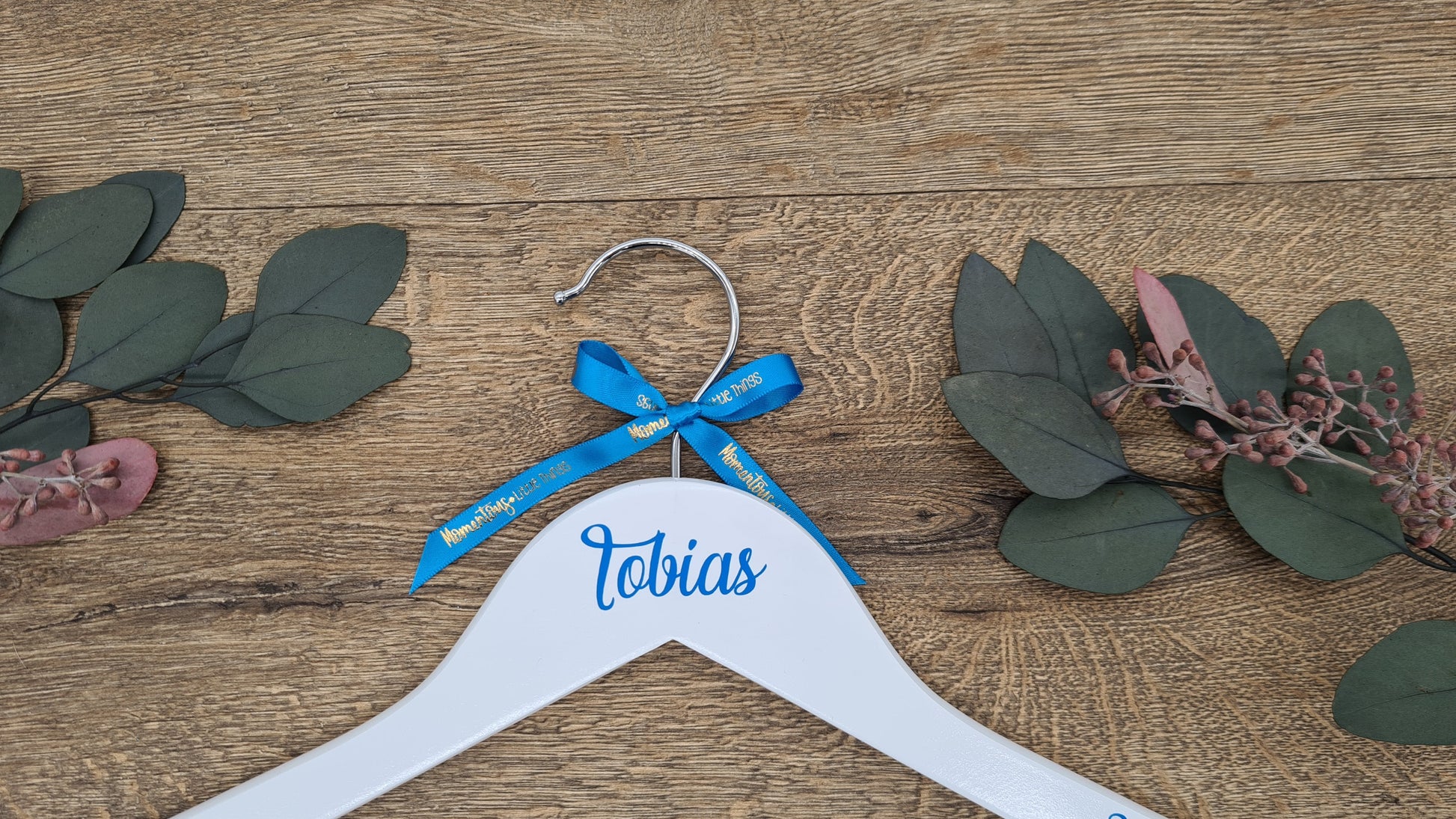 These stunning white, wooden hangers are personalised in an elegant black with the bride, groom or special wedding party's names.
