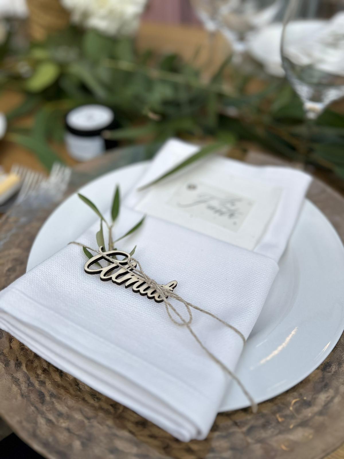 Mini-Holznamen aus 4mm natürlichem Holz, präzise mit Lasertechnik geschnitten, verleihen deinem Event eine persönliche und elegante Note. Ideal als Platzkarten für Hochzeiten oder andere Anlässe.