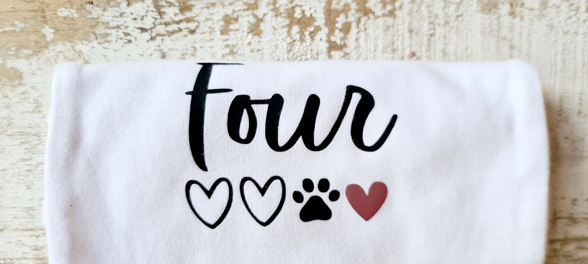 This baby onesie comes standard in a newborn size and features your little growing family. Mom and Dad are represented by hearts, dog sibling is represented by a paw and that new little beating heart is represented by a beautiful red heart.