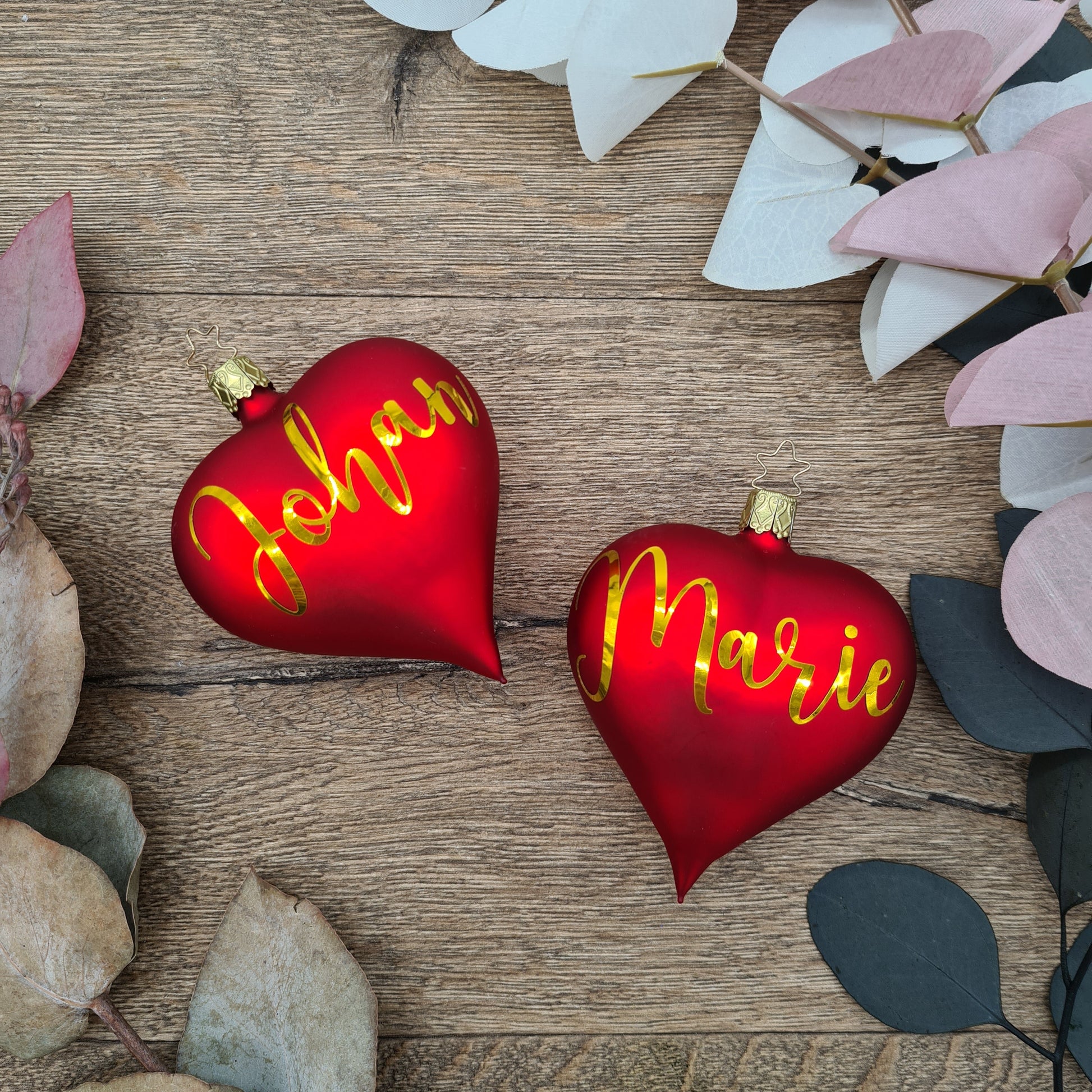 Die mundgeblasene rote Glaskugel hat die Form eines Herzens und ist 10 cm groß. Sie ist mit deinem individuellen Text in Weiß und einem farblich passenden Band versehen, damit du sie direkt an den Baum hängen kannst.