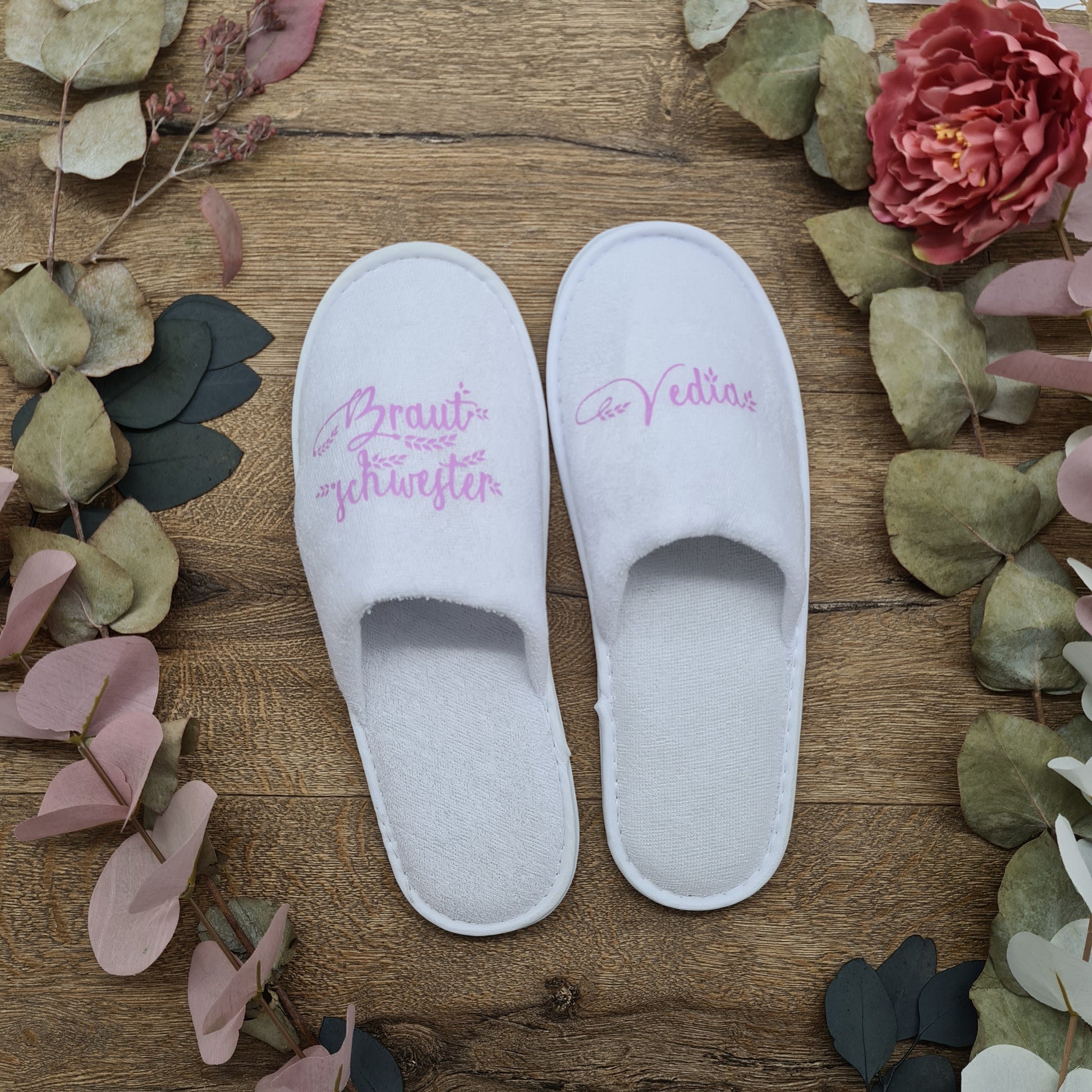 These slippers are personalised with a leaf wreath design, wedding role, such as "bride", "sister of the bride", "maid of honour", etc on the left and names on the right.