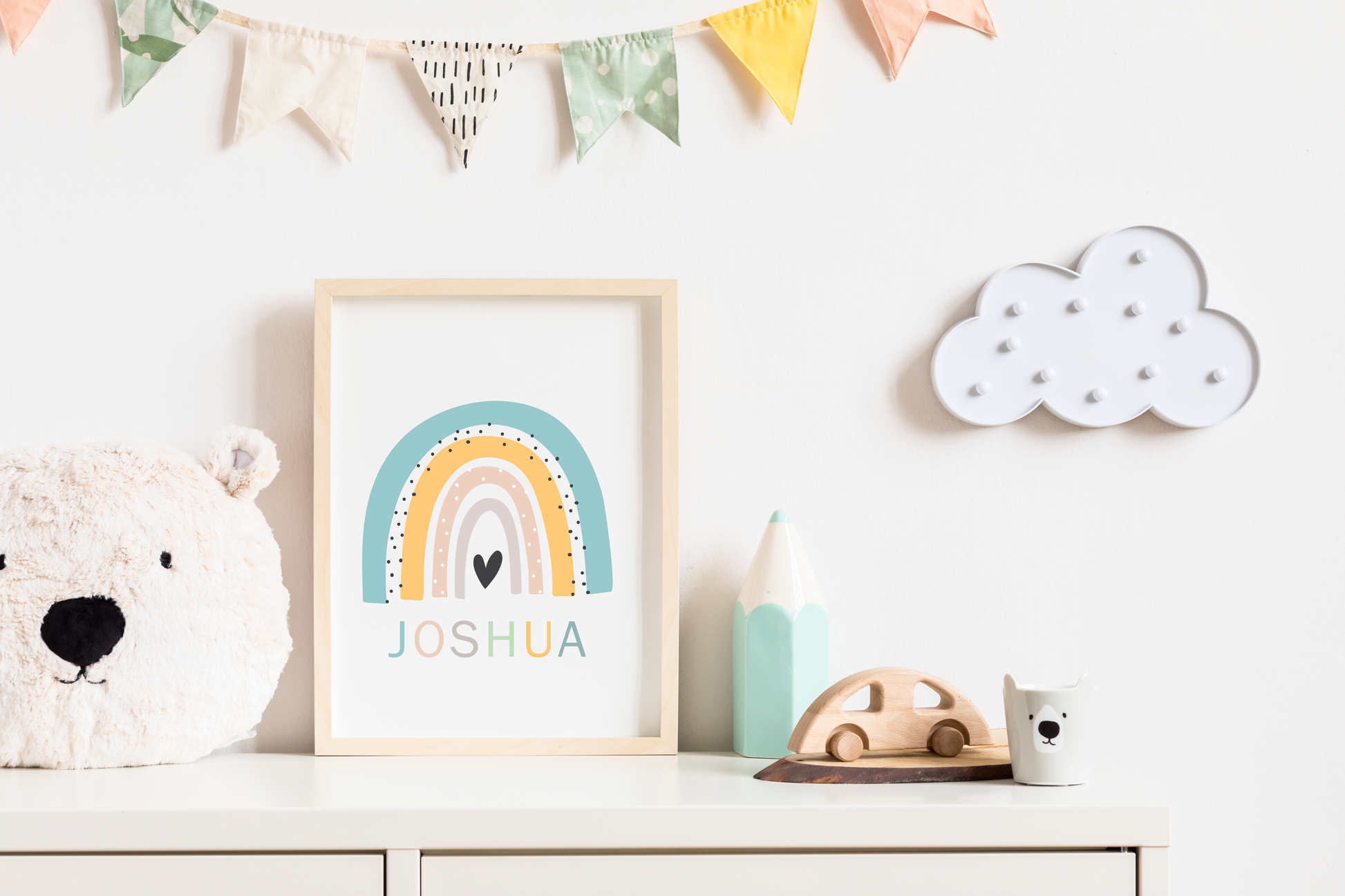If you're looking for a special detail to make your baby's room extra special, this rainbow nursery frame is perfect. This stunning rainbow print is personalized with your baby's name in beautiful pastel colours.