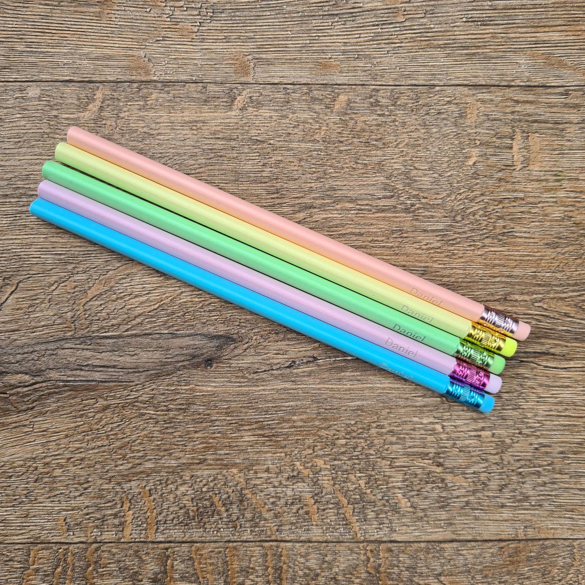Set aus 5 gemischten pastellfarbenen HB-Stiften für den Schulbedarf mit personalisierter Gravur.
