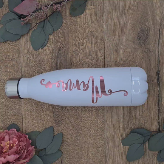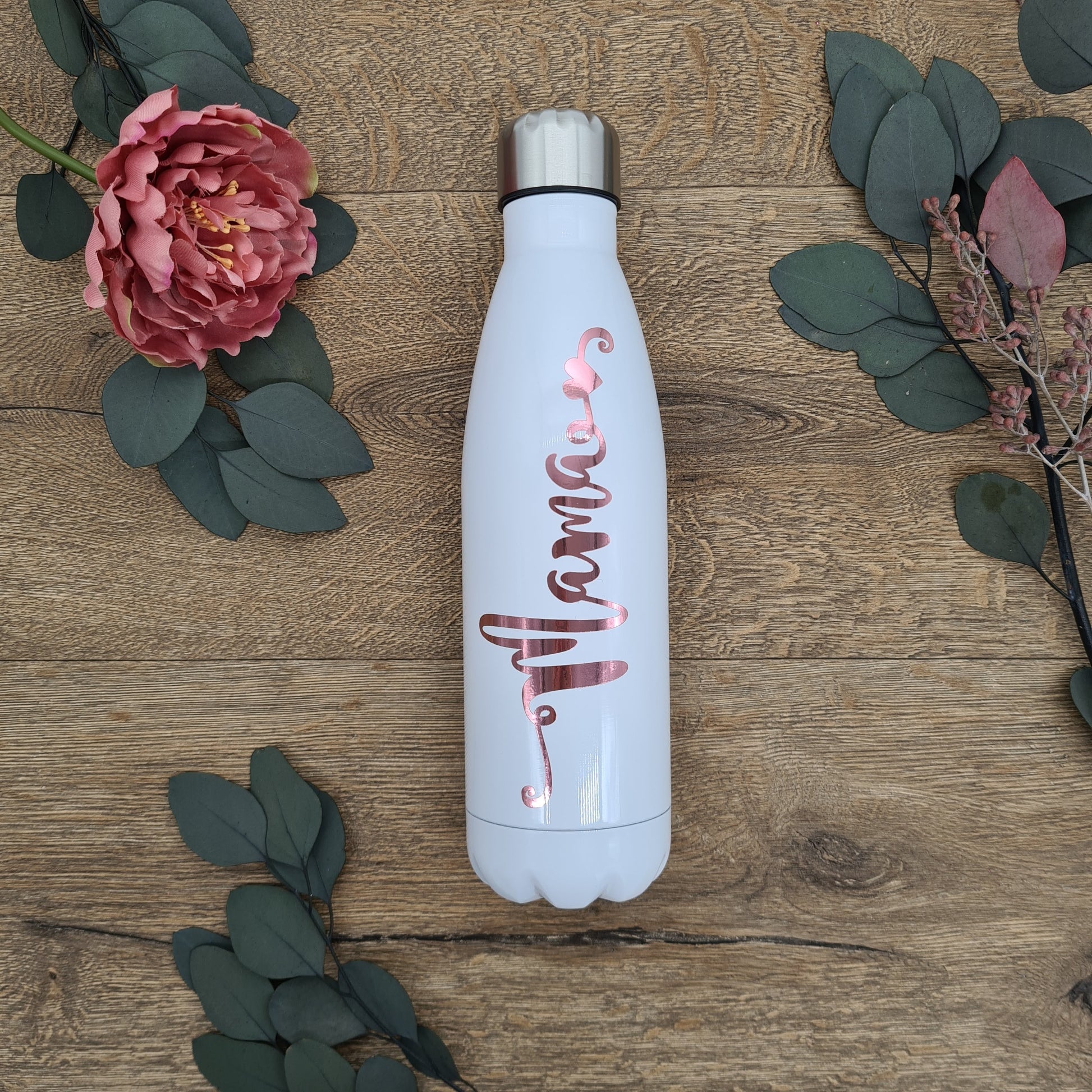 White Thermo bottles with rose gold vinyl foil for Mother's day.